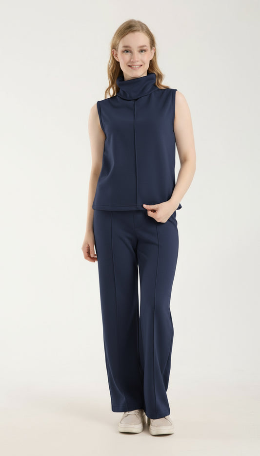 2 Parça Takım V Yaka Brami Üst ve Yüksek Bel Düz Paça Pantolon