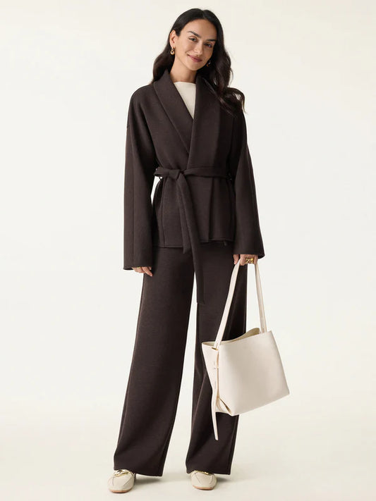 2 Parça Set Şal Kemerli Dış Giyim ve Cepli Yüksek Bel Düz Pantolon