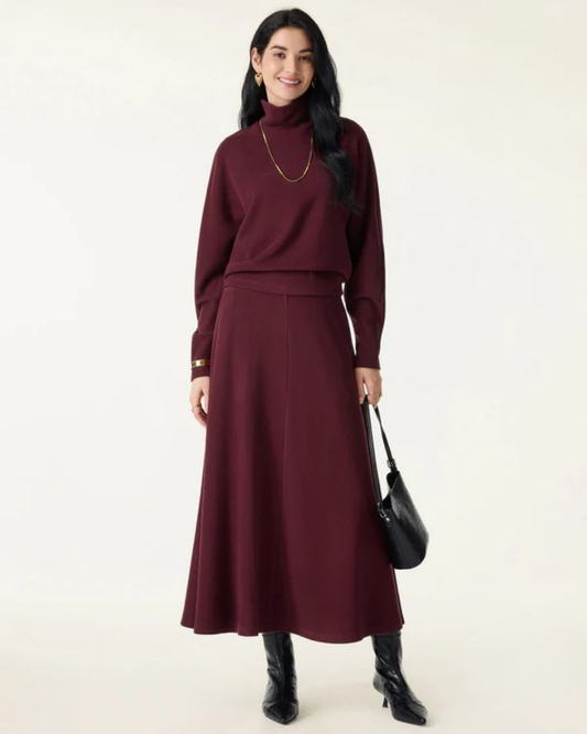 2 Parça Set Balıkçı Yaka Yarasa Kollu Brami ve Midi Cepli A Kesim Etek